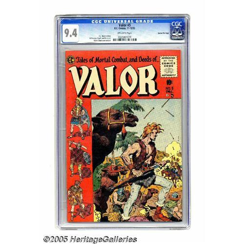<B>Valor #5 Gaines File pedigree (EC, 1955) CGC NM 9.4 Off-white pages.</B></I> This last issue of " "<B>Valor</B></I> signals the beginning of the end for EC's line of New Direction comics. They certainly went out with a bang with this great issue, loaded with exciting art by Wally Wood, Al Williamson, Graham Ingels, and George Evans. Although recognized by CGC as a Gaines File Copy, no certificate accompanies this book. Overstreet 2005 NM- 9.2 value = $210. CGC census 8/05: 1 in 9.4, 1 higher. <BR><BR><B>Important notice:</B> Heritage usually auctions material at the rate of 200-250 lots per hour. On some occasions eBay Live bid software or the Internet may not be able to keep up with the pace of the auction. We recommend placing a realistic absentee bid now as insurance to avoid disappointment. Occasionally the auctioneer may eliminate or reject an eBay Live bid, and the auctioneer may also reopen a lot after the close of the eBay live bidding (usually because we missed an audience bid), and may reject your bid even if it shows you as the winning bidder. By bidding via eBay Live, you agree that Heritage may award the lot to another bidder at its sole discretion under the circumstances described above or any other reasonable circumstances. Since eBay bids are not shown to us until we open the lot on the floor, we treat those bids just like floor bids. In most cases the floor responds before the eBay bid is presented to us, due to Internet lag time, so for consistency we have made it a policy that floor bids are always considered first over tie eBay live bids. Also please note that all Heritage lots purchased through eBay Live carry a 20% Buyer's Premium. Please make sure you read the Terms and Conditions before you bid. This lot is being auctioned in conjunction with a live floor auction by Heritage Galleries & Auctioneers. All final auction and invoice information will be supplied by Heritage Galleries & Auctioneers, and all other information should be considere