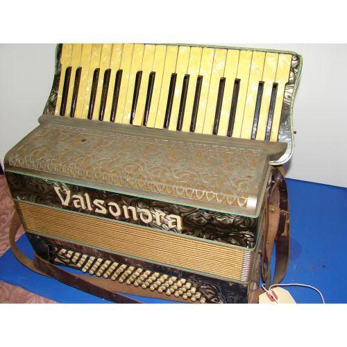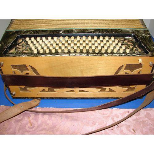 Black marbelized case with mother of pearl keys. Fancy chrome grill. 34 treble 80 bass ornate wood back. 16 1/2 " keyboard 15 1/2 x 8". Weight 20 lbs. Keys lifting and hole in grill.