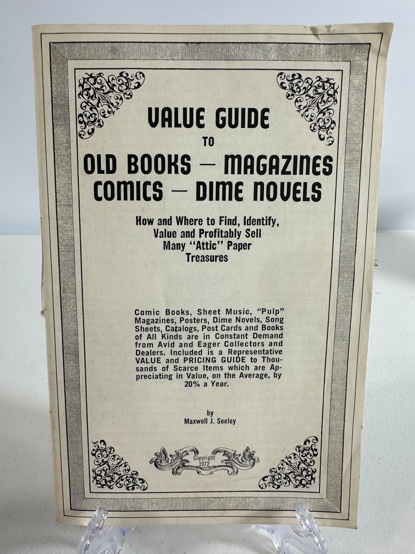 1972 collector's reference published in Montreal covering values for books, comics, pulps, posters, sheet music, and postcards. Condition: Good; some spine wear and surface marks.