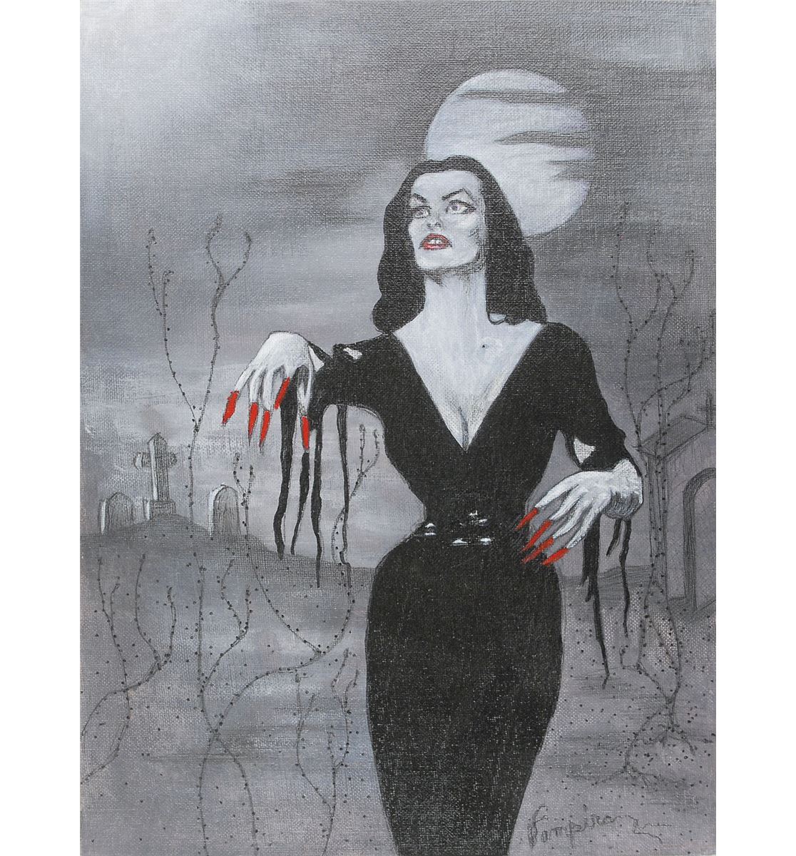 Original self-portrait artwork accomplished by Maila Nurmi in acrylic on an 11.75 x 16 canvas board, signed in the lower right, “Vampira.” The artwork shows the horror star up-close in a graveyard. In fine condition, with a clear plastic sheet taped around the edges of the signature area. The James Collings Collection.