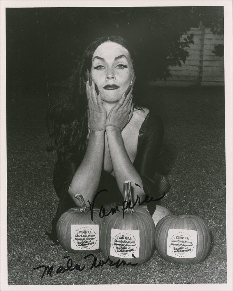 Glossy 8 x 10 photo of the glamour ghoul posing with three pumpkins, signed in black felt tip, “Vampira, Maila Nurmi.” In fine condition.