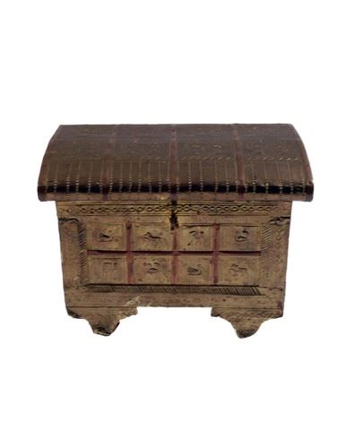 Direct from the hit TV show Vampire Diaries (2009– ) is this very elaborate detailed Egyptian designed metal box with wood wheels. This comes direct from the production. (approx. 7" x 9")