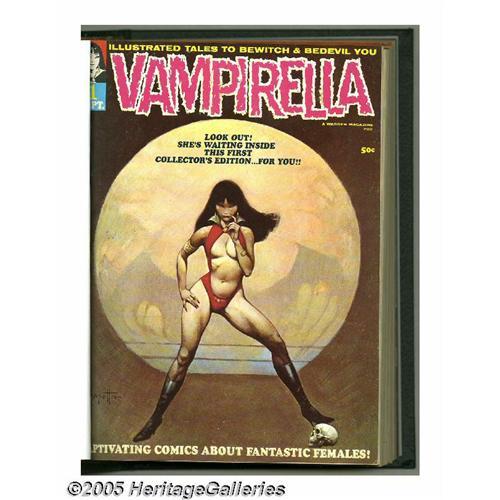 <B>Vampirella #1-10 And Other Magazines Bound Volume (Warren, 1969-81).</B></I> Marvel and DC bonuses await the winning bidder for this handsome bound volume, which contains trimmed and bound copies of <B>Vampirella</B></I> #1-10, the Warren one-shot <B>On The Scene Presents Super-Heroes</B></I>, Marvel's " <B>Bizarre Adventures</B></I> #27 (featuring the X-Men) and DC's "<B>In The Days Of The Mob</B></I> (with Jack Kirby art, and with the pull-out poster included). The spine of the book is embossed with the title and issue numbers (only " "<B>Vampirella</B></I> is mentioned), and the previous owner's name is embossed on the front of the book. Overstreet 2005 VG 4.0 value for group = $354. <BR><BR><B>Important notice:</B> Heritage usually auctions material at the rate of 200-250 lots per hour. On some occasions eBay Live bid software or the Internet may not be able to keep up with the pace of the auction. We recommend placing a realistic absentee bid now as insurance to avoid disappointment. Occasionally the auctioneer may eliminate or reject an eBay Live bid, and the auctioneer may also reopen a lot after the close of the eBay live bidding (usually because we missed an audience bid), and may reject your bid even if it shows you as the winning bidder. By bidding via eBay Live, you agree that Heritage may award the lot to another bidder at its sole discretion under the circumstances described above or any other reasonable circumstances. Since eBay bids are not shown to us until we open the lot on the floor, we treat those bids just like floor bids. In most cases the floor responds before the eBay bid is presented to us, due to Internet lag time, so for consistency we have made it a policy that floor bids are always considered first over tie eBay live bids. Also please note that all Heritage lots purchased through eBay Live carry a 20% Buyer's Premium. Please make sure you read the Terms and Conditions before you bid. This lot is being auctioned in conjunction with