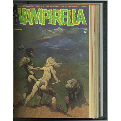 <B>Vampirella #1-10 And Other Magazines Bound Volume (Warren, 1969-81).</B></I> Marvel and DC bonuses await the winning bidder for this handsome bound volume, which contains trimmed and bound copies of <B>Vampirella</B></I> #1-10, the Warren one-shot <B>On The Scene Presents Super-Heroes</B></I>, Marvel's <B>Bizarre Adventures</B></I> #27 (featuring the X-Men) and DC's <B>In The Days Of The Mob</B></I> (with Jack Kirby art, and with the pull-out poster included). The spine of the book is embossed with the title and issue numbers (only <B>Vampirella</B></I> is mentioned), and the previous owner's name is embossed on the front of the book. Approximate Overstreet value for group = $375.<BR><BR><b>Shipping:</b> Books & Catalogs (<a target="_blank" href="http://www.heritageauctions.com/common/shipping.php">view shipping information</a>)