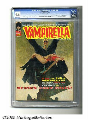<B>Vampirella #12 (Warren, 1971) CGC NM+ 9.6 Off-white pages.</B></I> Features the first time Jose Gonzalez drew Vampirella. Manuel Sanjulian cover (his first cover for Warren). Other artists include Frank Brunner, Jeff Jones, and Wally Wood. Overstreet 2005 NM- 9.2 value = $90. CGC census 1/05: 4 in 9.6, 1 higher. <I>From the collection of Chris Bell.</B></I>
