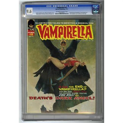 <B>Vampirella #12 (Warren, 1971) CGC NM+ 9.6 Off-white to white pages.</B></I> Jose Gonzalez art begins on Vampirella series. Manuel Sanjulian cover (his first cover for Warren). Other artists include Frank Brunner, Jeff Jones, and Wally Wood Overstreet 2007 NM- 9.2 value = $110. CGC census 10/07: 5 in 9.6, 1 higher.<BR><BR><b>Shipping:</b> Comics - Slabbed (certified) (<a target="_blank" href="http://www.heritageauctions.com/common/shipping.php">view shipping information</a>)