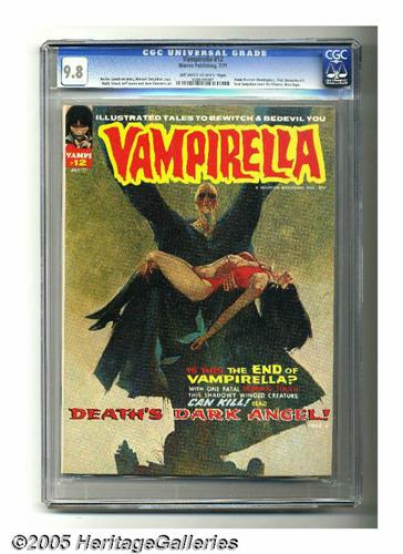 <B>Vampirella #12 (Warren, 1971) CGC NM/MT 9.8 Off-white to white pages.</B></I> Jose Gonzalez drew Vampirella for the first time in this issue, making it the "first of the 'classic' Vampirella strips" according to <B>The Warren Companion.</B></I> The issue also featured the first of Manuel Sanjulian's many great covers for Warren. The issue also has the art of Frank Brunner, Jeff Jones, and Wally Wood. Overstreet 2005 NM- 9.2 value = $90. CGC census 1/05: 1 in 9.8, none higher. <I>From the collection of Chris Bell.</B></I>