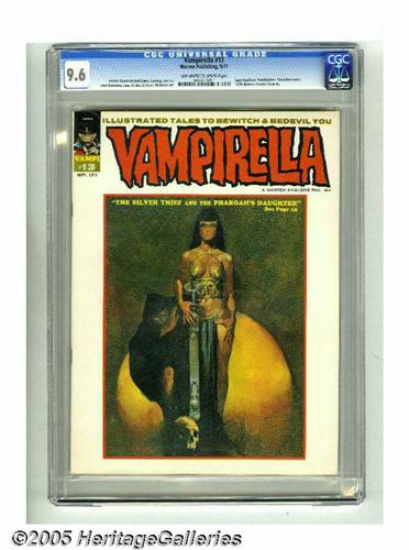 <B>Vampirella #13 (Warren, 1971) CGC NM+ 9.6 Off-white to white pages.</B></I> Manuel Sanjulian cover. Jose Gonzalez art. Anti-smoking back cover with Frank Frazetta art. Overstreet 2005 NM- 9.2 value = $90. CGC census 1/05: 2 in 9.6, 1 higher. <I>From the collection of Chris Bell.</B></I>