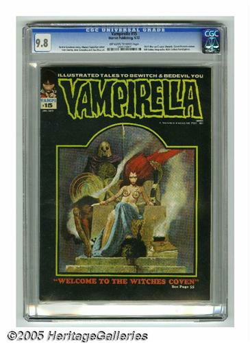 <B>Vampirella #15 (Warren, 1972) CGC NM/MT 9.8 Off-white to white pages.</B></I> 1971 Warren Creator Awards. Count Dracula cameo. Manuel Sanjulian cover. Richard Corben frontispiece. Luis Garcia, Jose Gonzalez, and Jose Bea art. Overstreet 2005 NM- 9.2 value = $90. CGC census 7/05: 4 in 9.8, none higher. <I>From the collection of Chris Bell.</B></I>
