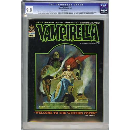 <B>Vampirella #15 (Warren, 1972) CGC NM/MT 9.8 Off-white pages.</B></I> This issue was the first of the series to be drawn entirely by Spanish artists (with the exception of a Richard Corben frontispiece). And what superb artists they were! The best known of the group are Manuel Sanjulian (who drew the cover), and Jose Gonzalez, who drew the main Vampirella feature. Overstreet 2006 NM- 9.2 value = $100. CGC census 4/06: 5 in 9.8, none higher.