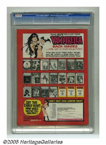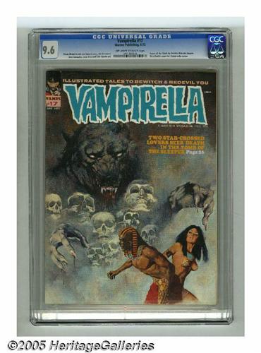 <B>Vampirella #17 (Warren, 1972) CGC NM+ 9.6 Off-white to white pages.</B></I> Enrich Torres cover. Interior art by Jose Gonzalez, Esteban Maroto (the beginning of the "Tomb of the Gods" feature), and Jerry Grandenetti. Overstreet 2005 NM- 9.2 value = $80. CGC census 1/05: 3 in 9.6, none higher. <I>From the collection of Chris Bell.</B></I>