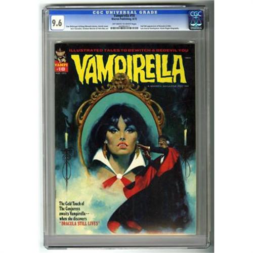 <B>Vampirella #18 (Warren, 1972) CGC NM+ 9.6 Off-white to white pages.</B></I> Second full appearance of Dracula in the title. Enrique Tores cover. Overstreet 2007 NM- 9.2 value = $100. CGC census 10/07: 5 in 9.6, none higher.<BR><BR><b>Shipping:</b> Comics - Slabbed (certified) (<a target="_blank" href="http://www.heritageauctions.com/common/shipping.php">view shipping information</a>)