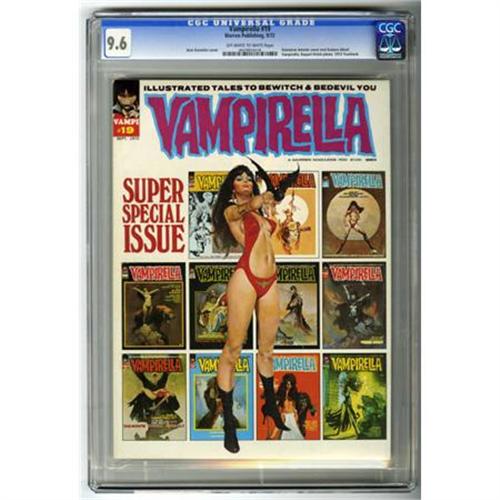 <B>Vampirella #19 (Warren, 1972) CGC NM+ 9.6 Off-white to white pages.</B></I> Square bound. Text feature about the creation of Vampirella. Dracula appearance. Raquel Welch photo. 1972 yearbook. Jose Gonzalez cover. Gonzalez, Wally Wood, Neal Adams, Reed Crandall, Jerry Grandenetti, and Ernie Colon art. Overstreet 2007 NM- 9.2 value = $120. CGC census 10/07: 5 in 9.6, 5 higher.<BR><BR><b>Shipping:</b> Comics - Slabbed (certified) (<a target="_blank" href="http://www.heritageauctions.com/common/shipping.php">view shipping information</a>)