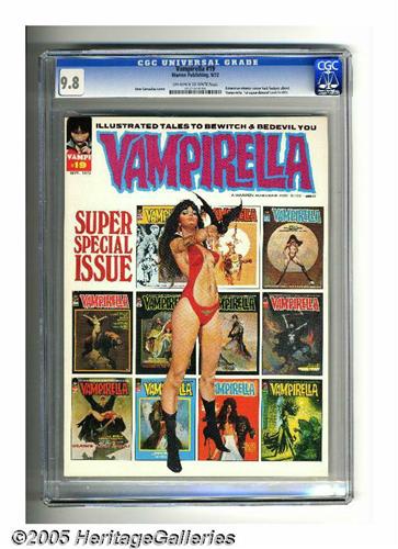 <B>Vampirella #19 (Warren, 1972) CGC NM/MT 9.8 Off-white to white pages.</B></I> Cover artist Jose Gonzalez also drew one of the issue's interior stories, which has an appearance by Dracula himself. There's also a text feature about the creation of Vampirella. Other artists in this square bound issue also include Wally Wood, Neal Adams, Reed Crandall, Jerry Grandenetti, and Ernie Colon. Overstreet 2005 NM- 9.2 value = $100. CGC census 1/05: 2 in 9.8, none higher. <I>From the collection of Chris Bell.</B></I>
