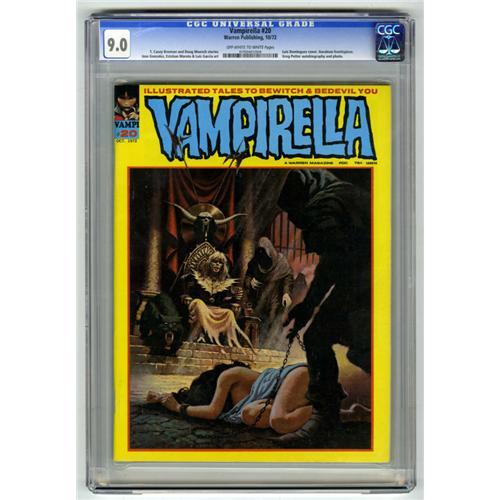 <B>Vampirella #20 (Warren, 1972) CGC VF/NM 9.0 Off-white to white pages.</B></I> Dracula appearance. Bondage cover by Luis Dominguez. Jose Gonzalez and Esteban Maroto art. Overstreet 2006 VF/NM 9.0 value = $69; NM- 9.2 value = $90. CGC census 2/07: 5 in 9.0, 9 higher.<BR><BR><b>Shipping:</b> Comics - Slabbed (certified) (<a target="_blank" href="http://www.heritageauctions.com/common/shipping.php">view shipping information</a>)
