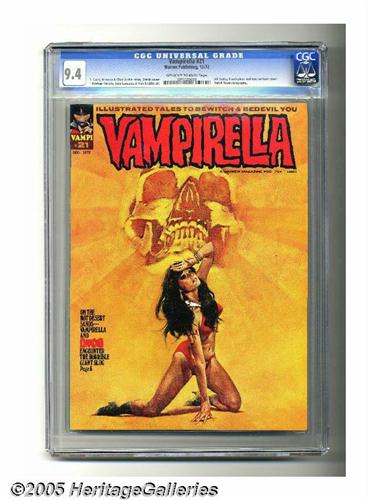 <B>Vampirella #21 (Warren, 1972) CGC NM 9.4 Off-white to white pages.</B></I> Enrich Torres cover. Jose Gonzalez, Esteban Maroto, and Rich Buckler art. Overstreet 2005 NM- 9.2 value = $80. CGC census 1/05: 3 in 9.4, 1 higher. <I>From the collection of Chris Bell.</B></I>