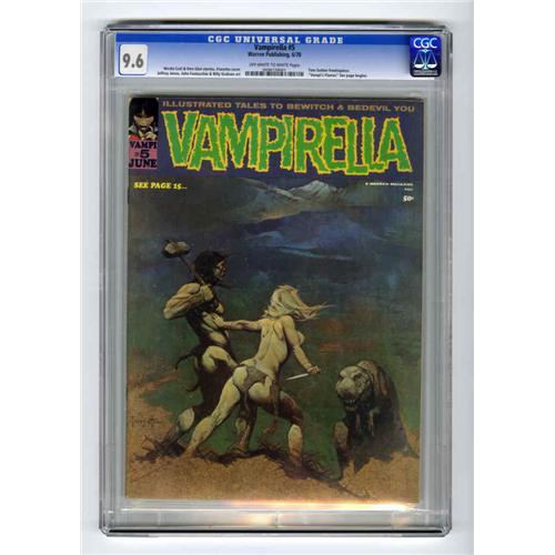 <B>Vampirella #5 (Warren, 1970) CGC NM+ 9.6 Off-white to white pages.</B></I> A stunning Frank Frazetta dinosaur cover gets the party started on this early issue. Inside, there's art by Jeff Jones and Tom Sutton, plus, the "Vampi's Flames" fan page begins here. Overstreet 2005 NM- 9.2 value = $150. CGC census 11/05: 4 in 9.6, none higher.