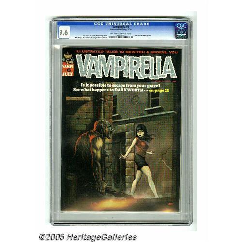 <B>Vampirella #6 (Warren, 1970) CGC NM+ 9.6 Off-white to white pages.</B></I> The mag has a fantastic ""good girl"" horror cover by Ken Kelly, plus interior art by Jerry Grandenetti, Jack Sparling, Mike Royer, and Dan Adkins. Overstreet 2005 NM- 9.2 value = $145. CGC census 9/05: 7 in 9.6, 1 higher. <BR><BR><B>Important notice:</B> Heritage usually auctions material at the rate of 200-250 lots per hour. On some occasions eBay Live bid software or the Internet may not be able to keep up with the pace of the auction. We recommend placing a realistic absentee bid now as insurance to avoid disappointment. Occasionally the auctioneer may eliminate or reject an eBay Live bid, and the auctioneer may also reopen a lot after the close of the eBay live bidding (usually because we missed an audience bid), and may reject your bid even if it shows you as the winning bidder. By bidding via eBay Live, you agree that Heritage may award the lot to another bidder at its sole discretion under the circumstances described above or any other reasonable circumstances. Since eBay bids are not shown to us until we open the lot on the floor, we treat those bids just like floor bids. In most cases the floor responds before the eBay bid is presented to us, due to Internet lag time, so for consistency we have made it a policy that floor bids are always considered first over tie eBay live bids. Also please note that all Heritage lots purchased through eBay Live carry a 20% Buyer's Premium. Please make sure you read the Terms and Conditions before you bid. This lot is being auctioned in conjunction with a live floor auction by Heritage Galleries & Auctioneers. All final auction and invoice information will be supplied by Heritage Galleries & Auctioneers, and all other information should be considered preliminary. Lot:3401 <BR><BR><B>Winning Notification and Billing:</B> After the FINAL session in this auction is complete, Heritage will send e-mail and snail mail invoices. This process normally ta