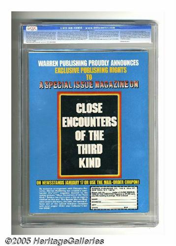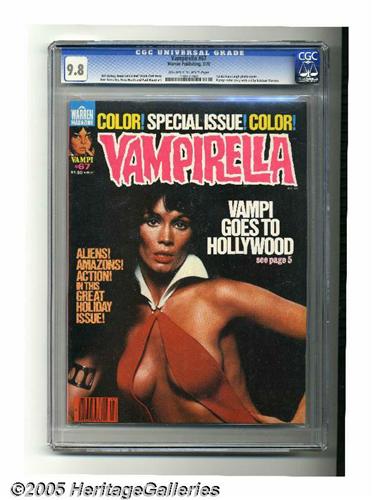 <B>Vampirella #67 (Warren, 1978) CGC NM/MT 9.8 Off-white to white pages.</B></I> Photo cover featuring actress Barbara Leigh. Color insert with Esteban Maroto art. Also art by Jose Gonzalez, Russ Heath, Alex Nino, and Paul Neary. Overstreet 2005 NM- 9.2 value = $35. CGC census 1/05: in , higher. <I>From the collection of Chris Bell.</B></I>