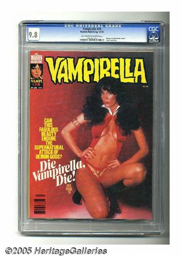 <B>Vampirella #74 (Warren, 1978) CGC NM/MT 9.8 Off-white to white pages.</B></I> 1978 Yearbook. Photo cover featuring actress Barbara Leigh. Jose Gonzalez and Esteban Maroto art. Overstreet 2005 NM- 9.2 value = $35. CGC census 1/05: 2 in 9.8, none higher. <I>From the collection of Chris Bell.</B></I>