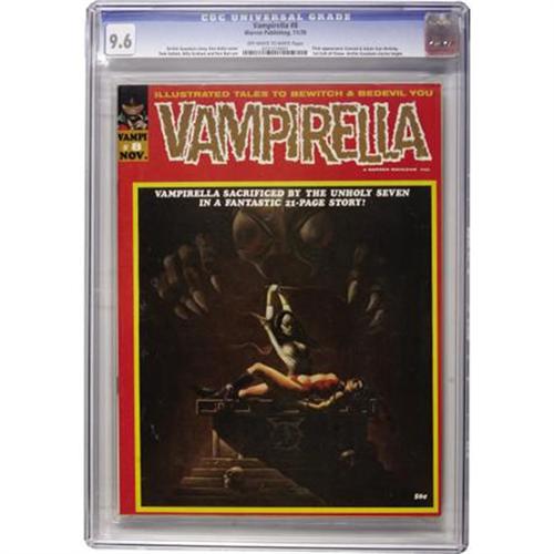 <B>Vampirella #8 (Warren, 1970) CGC NM+ 9.6 Off-white to white pages.</B></I> This is the first time that Vampirella appears as a serious character. This ish also contains the first appearance of Conrad and Adam Van Helsing and it's Archie Goodwin's first issue as a writer. Ken Kelly did the cover while interior art was done by Tom Sutton, Jack Sparling, George Roussos, Frank Frazetta (one page), and "Tony Williamsune" (Tony Tallarico and Bill Fraccio). Overstreet 2007 NM- 9.2 value = $190. CGC census 5/07: 5 in 9.6, 3 higher.<BR><BR><b>Shipping:</b> Comics - Slabbed (certified) (<a target="_blank" href="http://www.heritageauctions.com/common/shipping.php">view shipping information</a>)