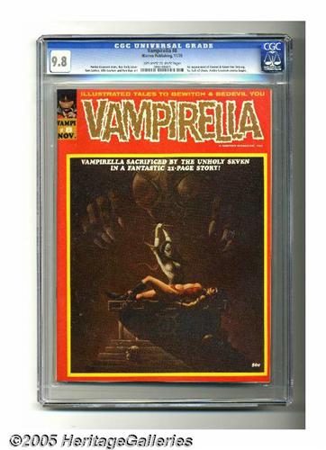 <B>Vampirella #8 (Warren, 1970) CGC NM/MT 9.8 Off-white to white pages.</B></I> Vampirella, who had served as host of this title's horror tales, made her debut as a serious character in this issue. Another first here was Archie Goodwin's debut as writer -- Goodwin's writing and editing would make quite an impact on the Warren line. The mag has a Ken Kelly cover, with interior art by Tom Sutton, Jack Sparling, George Roussos, Frank Frazetta (one page), and "Tony Williamsune" (Tony Tallarico and Bill Fraccio). Overstreet 2005 NM- 9.2 value = $160. CGC census 1/05: 2 in 9.8, none higher. <I>From the collection of Chris Bell.</B></I>