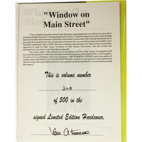 <B>Van Arsdale France - "Window On Main Street" Signed Limited Edition Hardcover, 348/500 (Laughter Publications/Stabur Press, 1991).</B></I> For over thirty-six years Van Arsdale France was employed by Walt Disney, in charge of training the legions of employees who worked at Disneyland, from its inception in 1954 on. Van was appointed "Founder and Professor Emeritus of the Disney Universities", and his story is rich with fascinating anecdotes, including the building of the fabulous Disneyland park and the many talented people who helped make it happen. Signed and numbered on a special insert page. In Excellent condition. <BR><BR><B>Important notice:</B> Heritage usually auctions material at the rate of 200-250 lots per hour. On some occasions eBay Live bid software or the Internet may not be able to keep up with the pace of the auction. We recommend placing a realistic absentee bid now as insurance to avoid disappointment. Occasionally the auctioneer may eliminate or reject an eBay Live bid, and the auctioneer may also reopen a lot after the close of the eBay live bidding (usually because we missed an audience bid), and may reject your bid even if it shows you as the winning bidder. By bidding via eBay Live, you agree that Heritage may award the lot to another bidder at its sole discretion under the circumstances described above or any other reasonable circumstances. Since eBay bids are not shown to us until we open the lot on the floor, we treat those bids just like floor bids. In most cases the floor responds before the eBay bid is presented to us, due to Internet lag time, so for consistency we have made it a policy that floor bids are always considered first over tie eBay live bids. Also please note that all Heritage lots purchased through eBay Live carry a 22.5% Buyer's Premium. Please make sure you read the Terms and Conditions before you bid. This lot is being auctioned in conjunction with a live floor auction by Heritage Auction Galleries. All final auction and invoice information will be supplied by Heritage Auction Galleries, and all other information should be considered preliminary. Lot:41001 <BR><BR><B>Winning Notification and Billing:</B> After the FINAL session in this auction is complete, Heritage will send e-mail and snail mail invoices. This process normally takes several days. All final auction and invoice information will be supplied by Heritage Auction Galleries, and all other information should be considered preliminary. <BR><BR>This auction will be conducted on a live auction floor and over the Internet through eBay Live. If you choose to place an absentee bid, please take a moment to <font color='#0000ff'><u><a href='http://pages.ebay.com/liveauctions/help/before/laabsentee.html'>learn how eBay Live absentee bidding works</a></u></font><font color='#000000'>