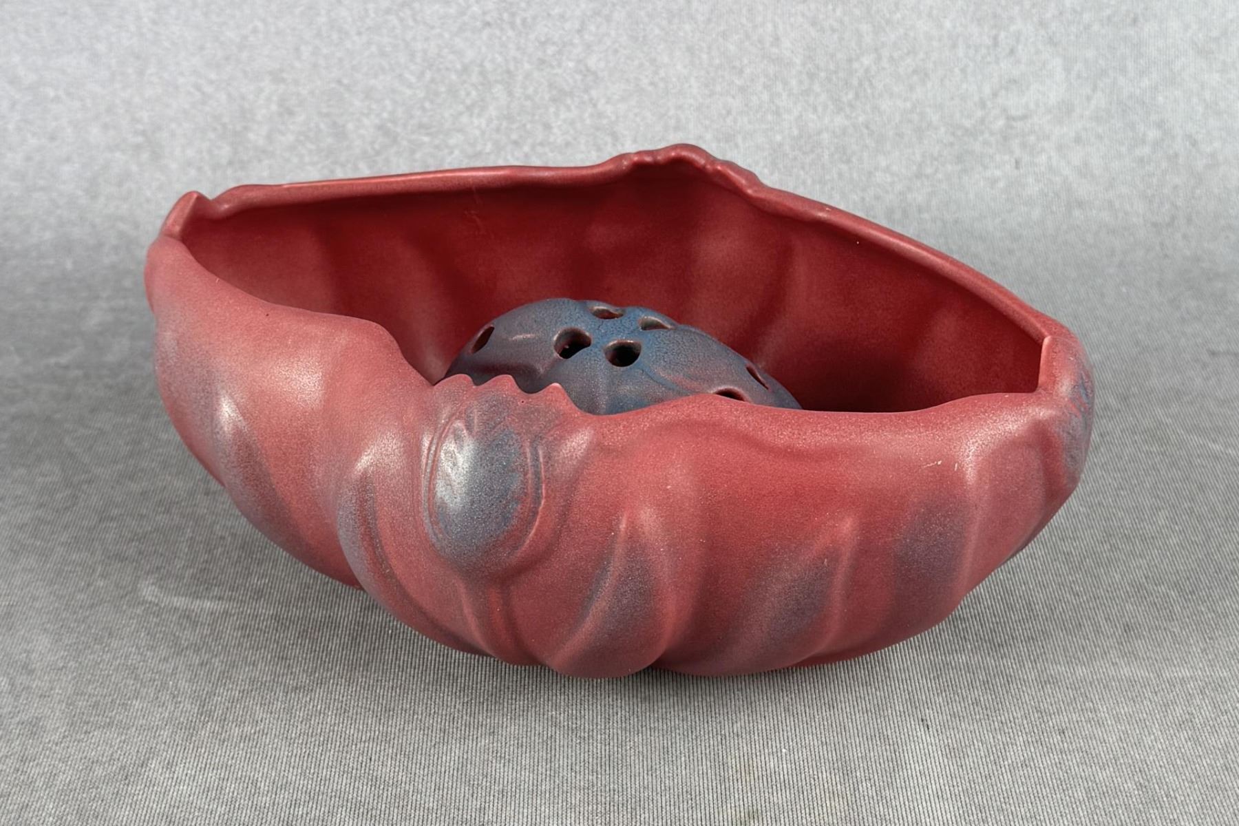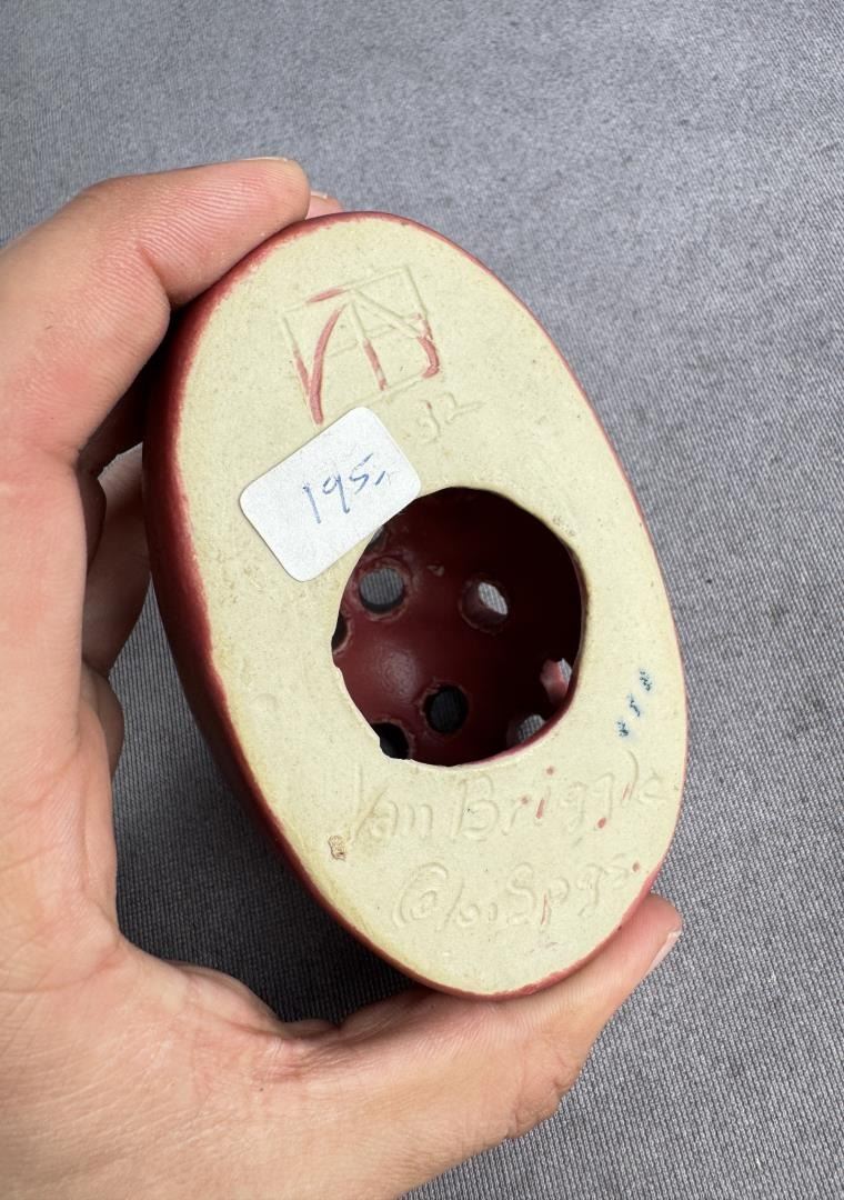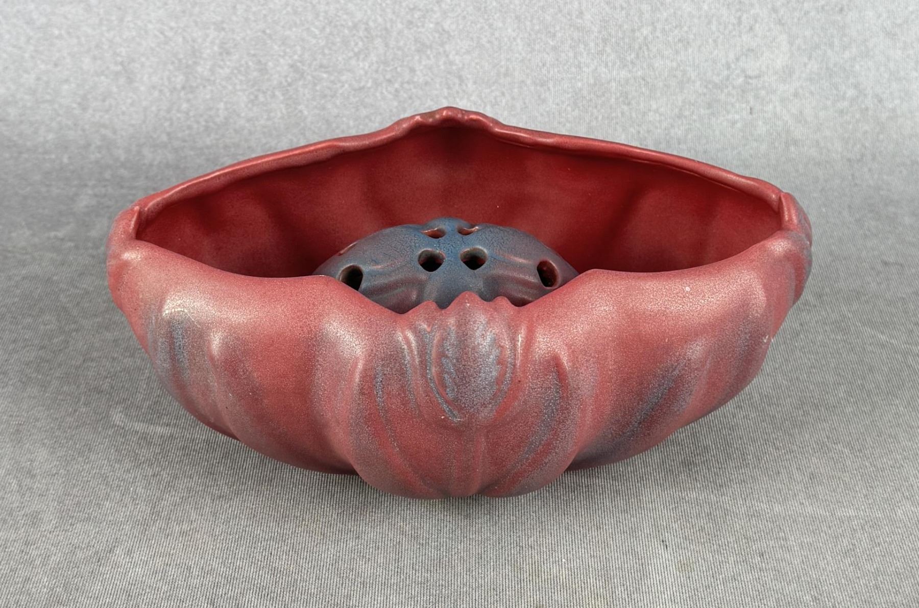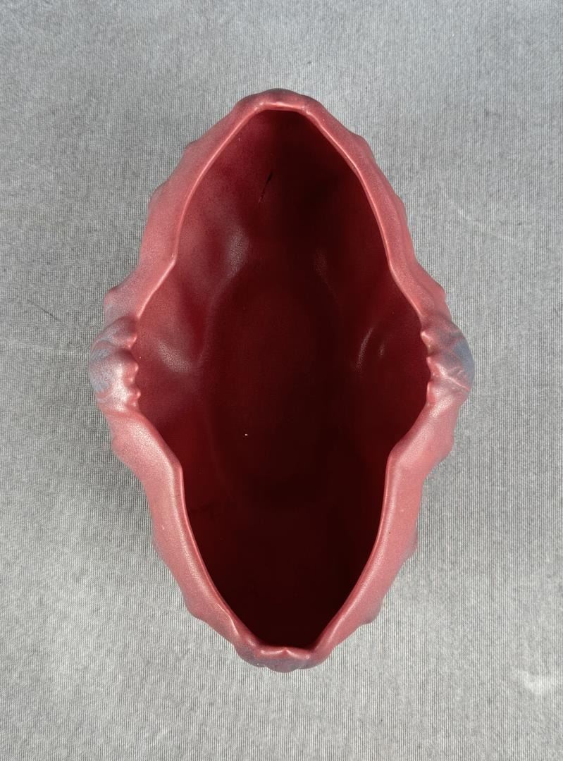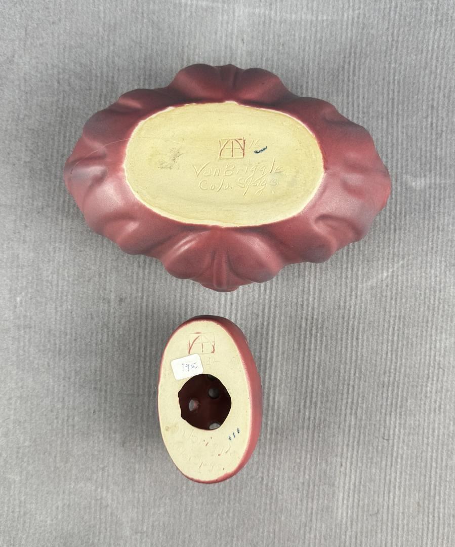 8" by 5 5/8" by 3 1/4". Comes with matching flower frog. Tulip Pattern.