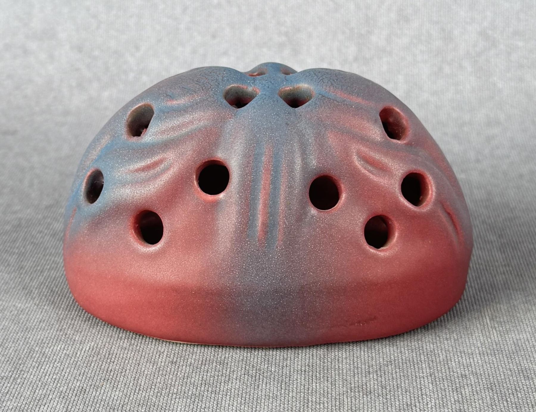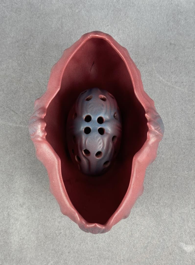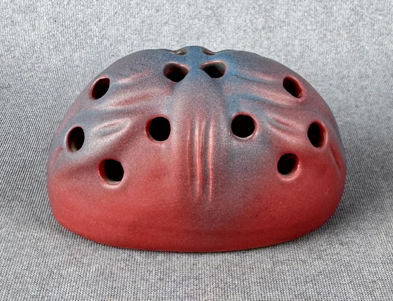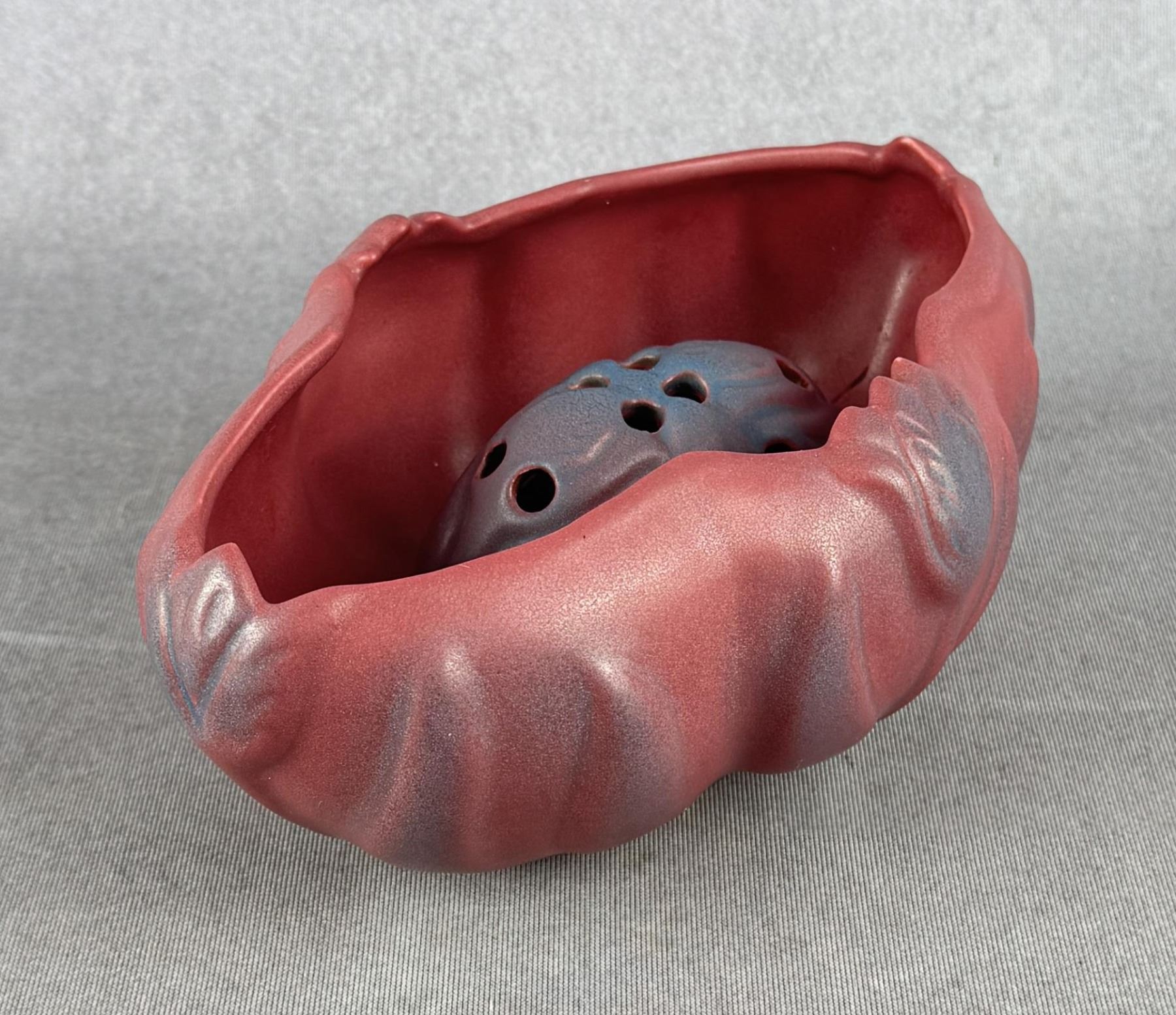 8" by 5 5/8" by 3 1/4". Comes with matching flower frog. Tulip Pattern.