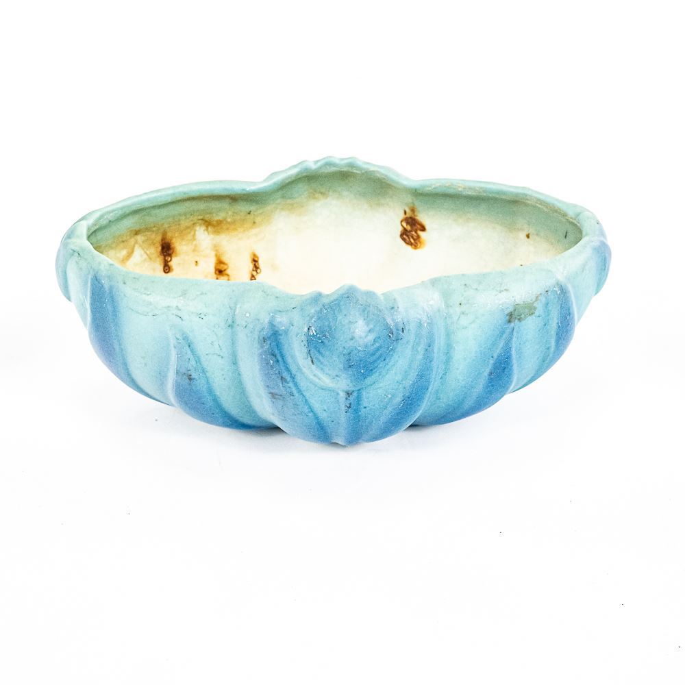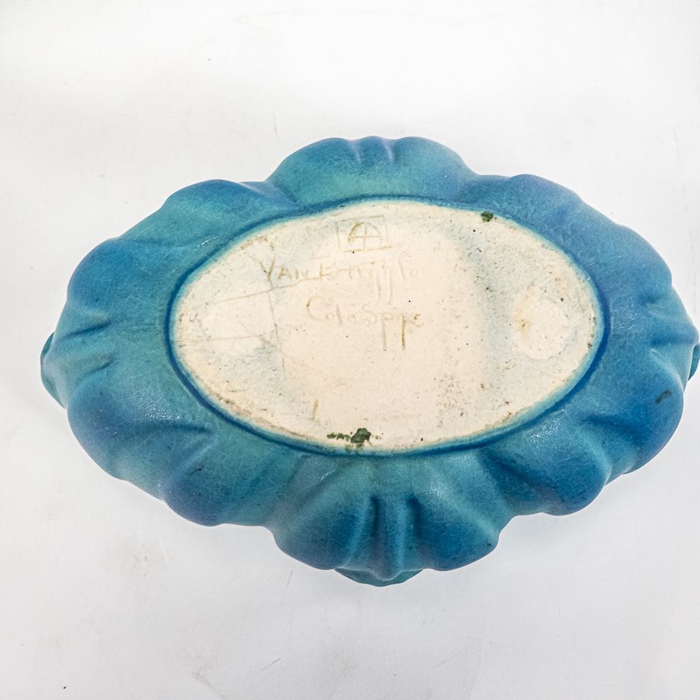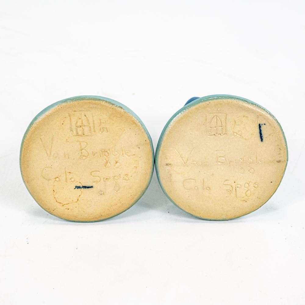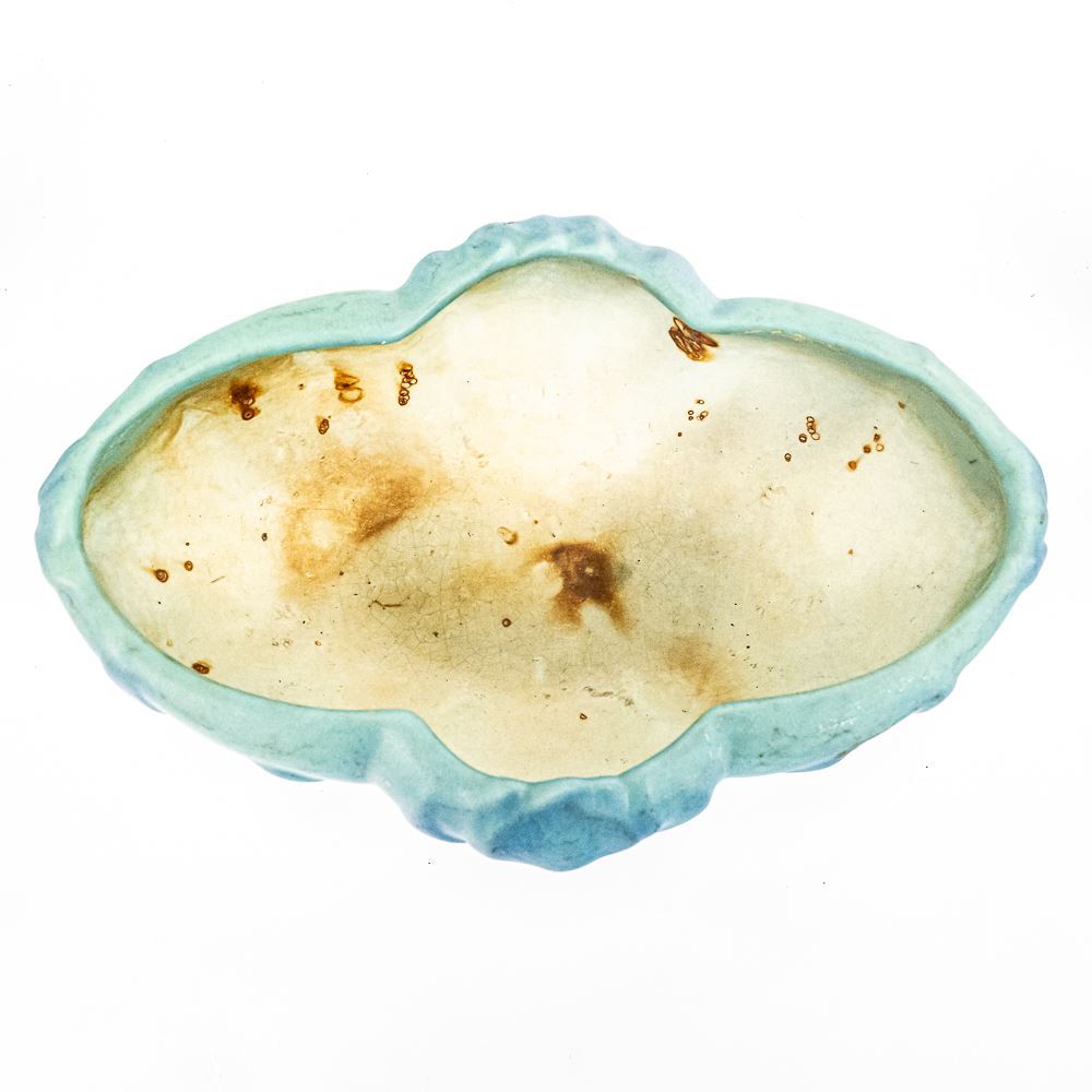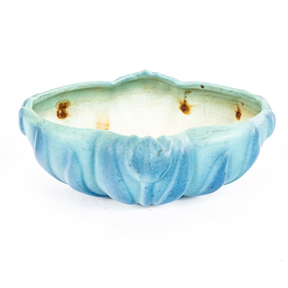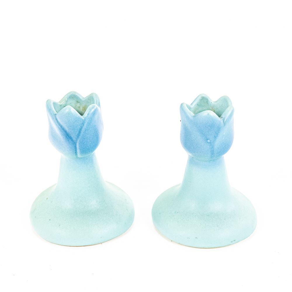 Van Briggle Pottery from Colorado Springs Tulip floral designed console base with matching candlestick holder pair. Bowl shows some discoloration, stains & crazing while the candlestick pair is in very good condition. Perfect addition to your collection, please use photos to judge condition and bid accordingly.