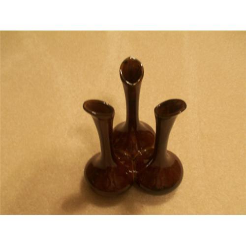 This is an unusual piece of Van Briggle. The vase is three vases in one, very different, and in a beautiful rich brown glaze, color is sharp and vivid. <P> The vase is six inches in height and is four inches at the base. <P> This is a very attractive shaped piece of pottery with the three vases in one and the rich brown glaze. <P> The piece is marked on the bottom, I am not sure of the age on this piece but believe is an older piece of VanBriggle. <P> This vase is in really great condition with no chips, cracks or crazing.