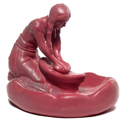 Van Briggle figural, "Hopi Maiden" under a maroon and blue matt glaze, 6.5"w x 5.5"h; with a Rookwood paperweight, (not shown), nude in an ivory matt, 1929, signed by Abel, #2868, 4.5"w