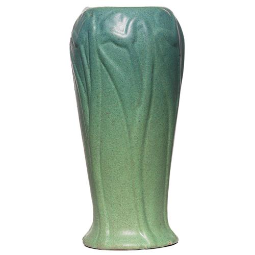 Van Briggle vase, ca. 1916, tulips under a green matt, 9.25"h, chip to base; with a Van Briggle vase, (not shown), blue and maroon matt, 7.25"h; with a Van Briggle vase, (not shown), ca. pre-1930, leaf design, blue and maroon matt, 3"h; with a Van Briggle