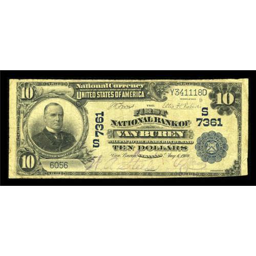<B>Van Buren, AR</B></I> - $10 1902 Plain Back Fr. 624 <B>The First NB</B></I> Ch. # (S)7361<BR> The paper is solid for the grade with a deep blue overprint and partially remaining signatures. <B>Very Good.</B></I><BR><BR><b>Shipping:</b> Coins & Currency (<a target="_blank" href="http://www.heritageauctions.com/common/shipping.php">view shipping information</a>)