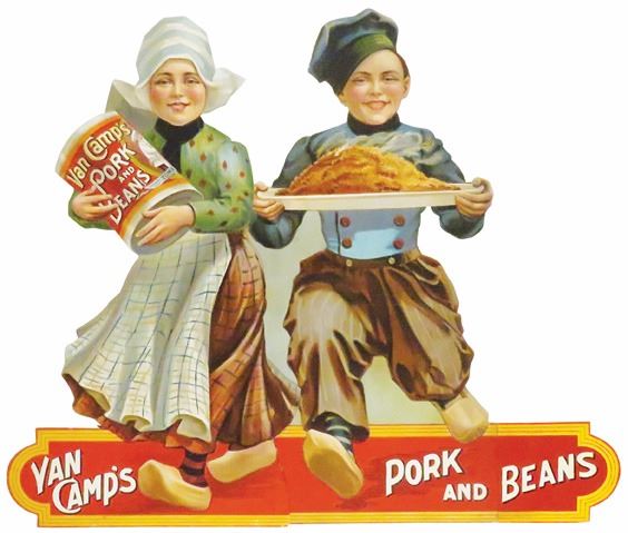 Van Camp's Pork and Beans Die Cut Cardboard Sign. Repaired tear on bonnet flap otherwise excellent condition. Professionally framed and matted. 19 1/4 X 16 inches.