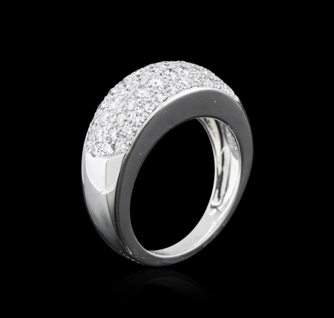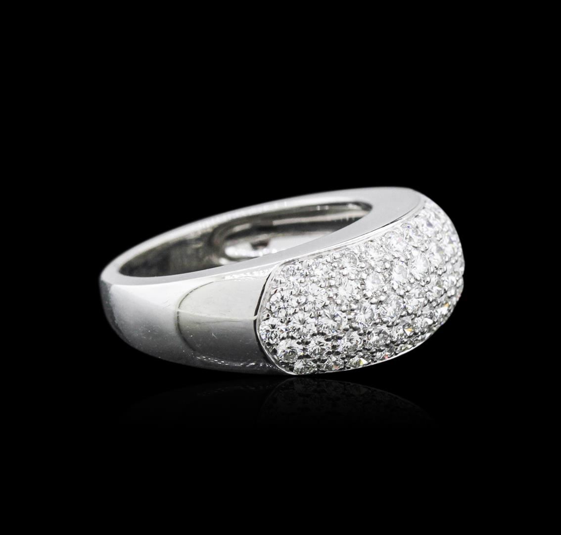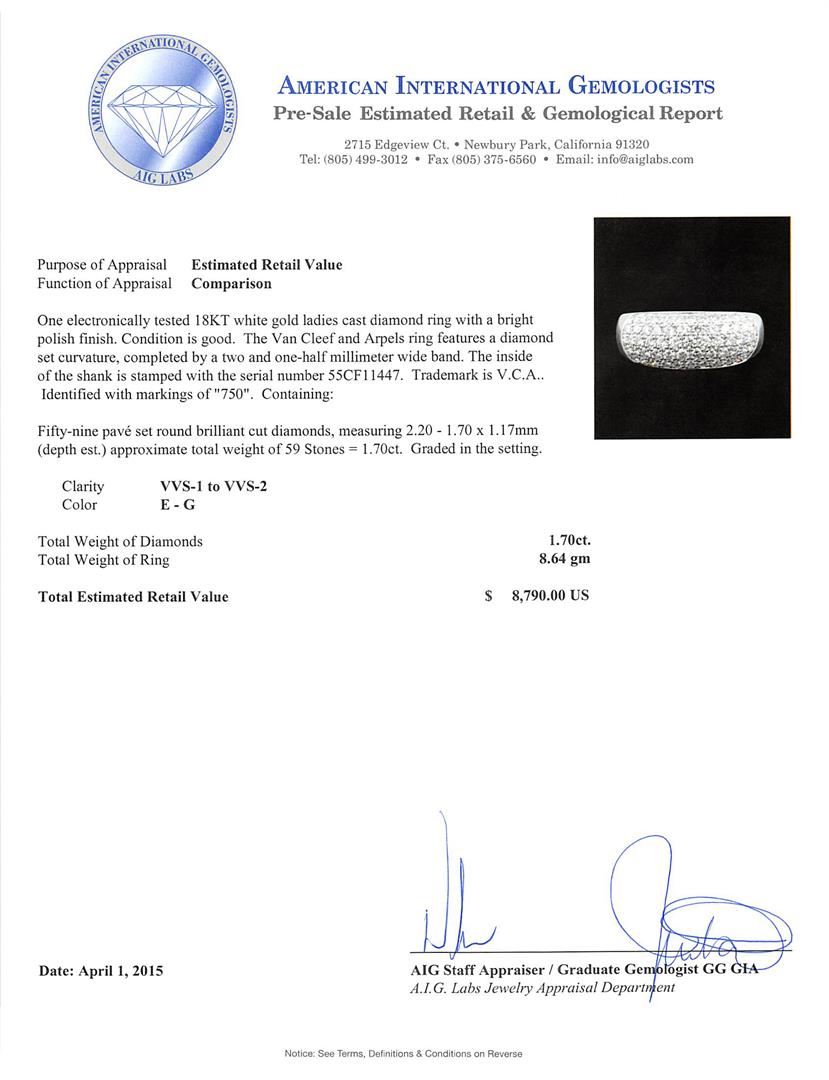 One electronically tested 18KT white gold ladies cast diamond ring with a bright polish finish. The Van Cleef and Arpels ring features a diamond set curvature, completed by a two and one-half millimeter wide band. The inside of the shank is stamped with the serial number 55CF11447. Trademark is V.C.A. Identified with markings of "750". Condition is good. Containing: Fifty-Nine pave set round brilliant cut diamonds, measuring 2.20 - 1.70 x 1.17mm (depth est.) approximate total weight of 59 Stones = 1.70ct. Graded in the setting. Clarity: VVS-1 to VVS-2 Color E - G. Total Weight of Diamonds 1.70ct. Total Weight of Ring 8.64 grams. AIG Appraised at $8,790.00.