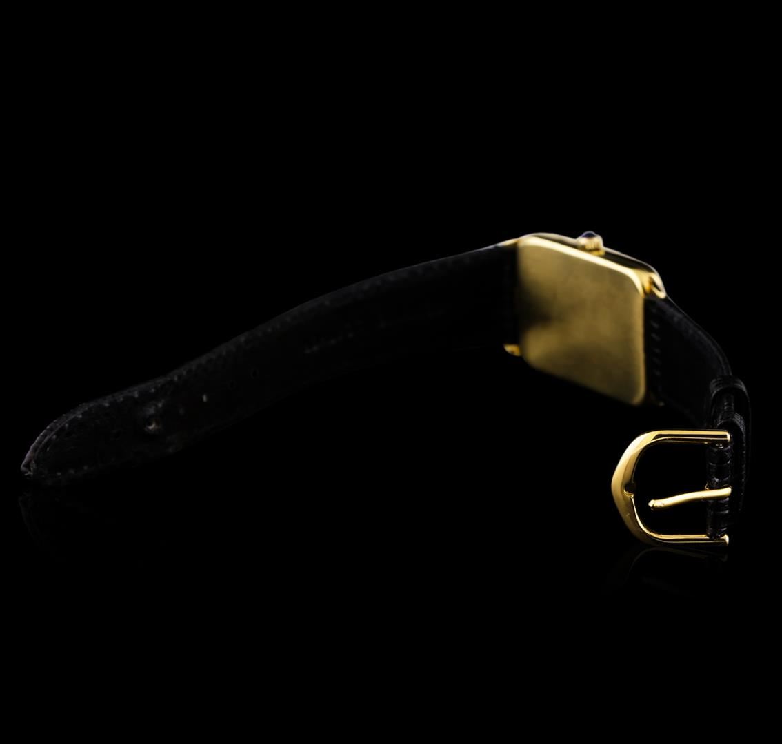 One Van Cleef & Arpels watch featuring: Case: 14KT yellow gold. Crown: Push/pull set with sapphire. Dial: Gold color; black hour and minute hands. Bracelet: Black leather. Condition: Barely noticeable surface scratches on case and buckle, but otherwise there are no major signs of wear.