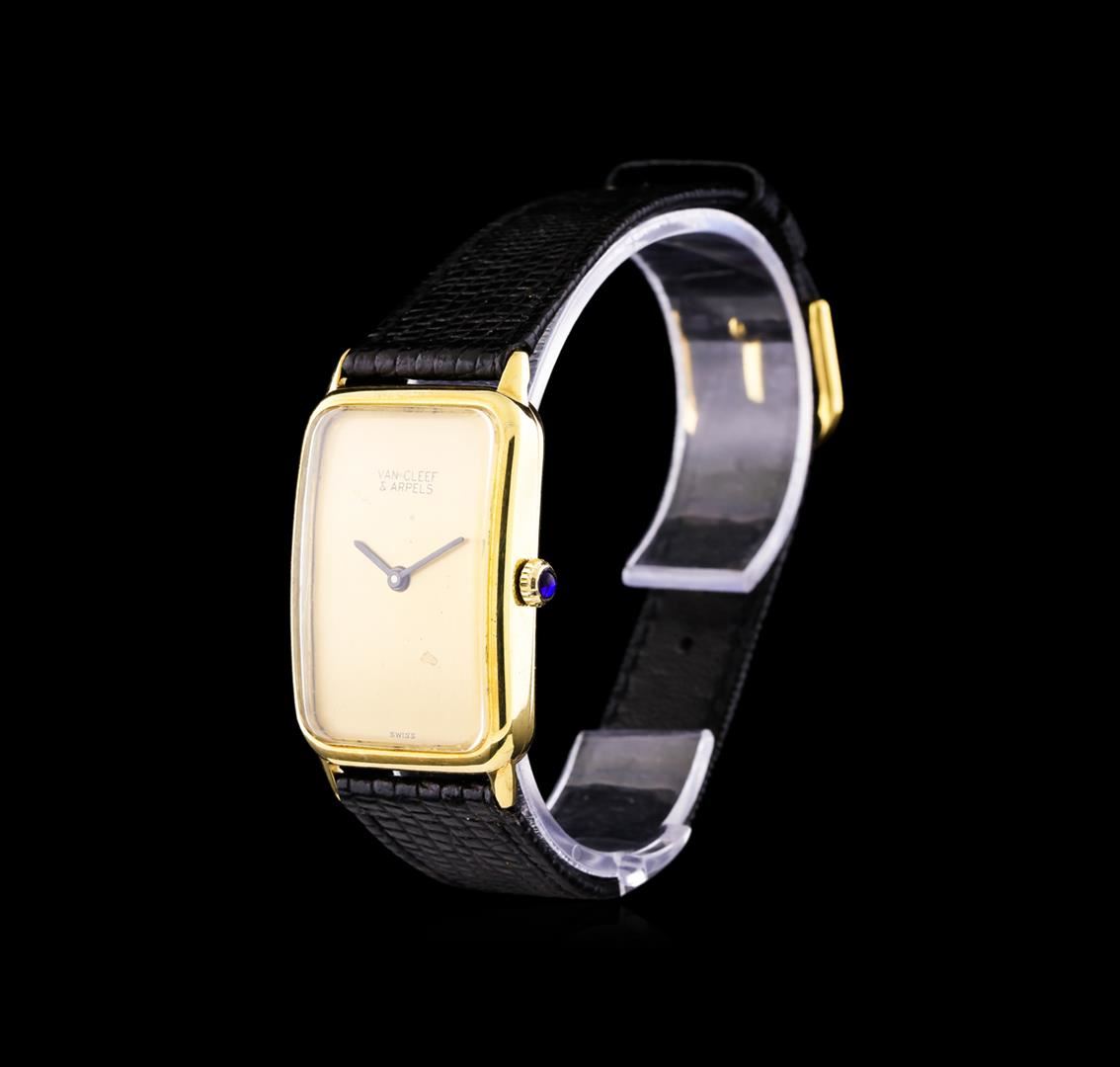 One Van Cleef & Arpels watch featuring: Case: 14KT yellow gold. Crown: Push/pull set with sapphire. Dial: Gold color; black hour and minute hands. Bracelet: Black leather. Condition: Barely noticeable surface scratches on case and buckle, but otherwise there are no major signs of wear.