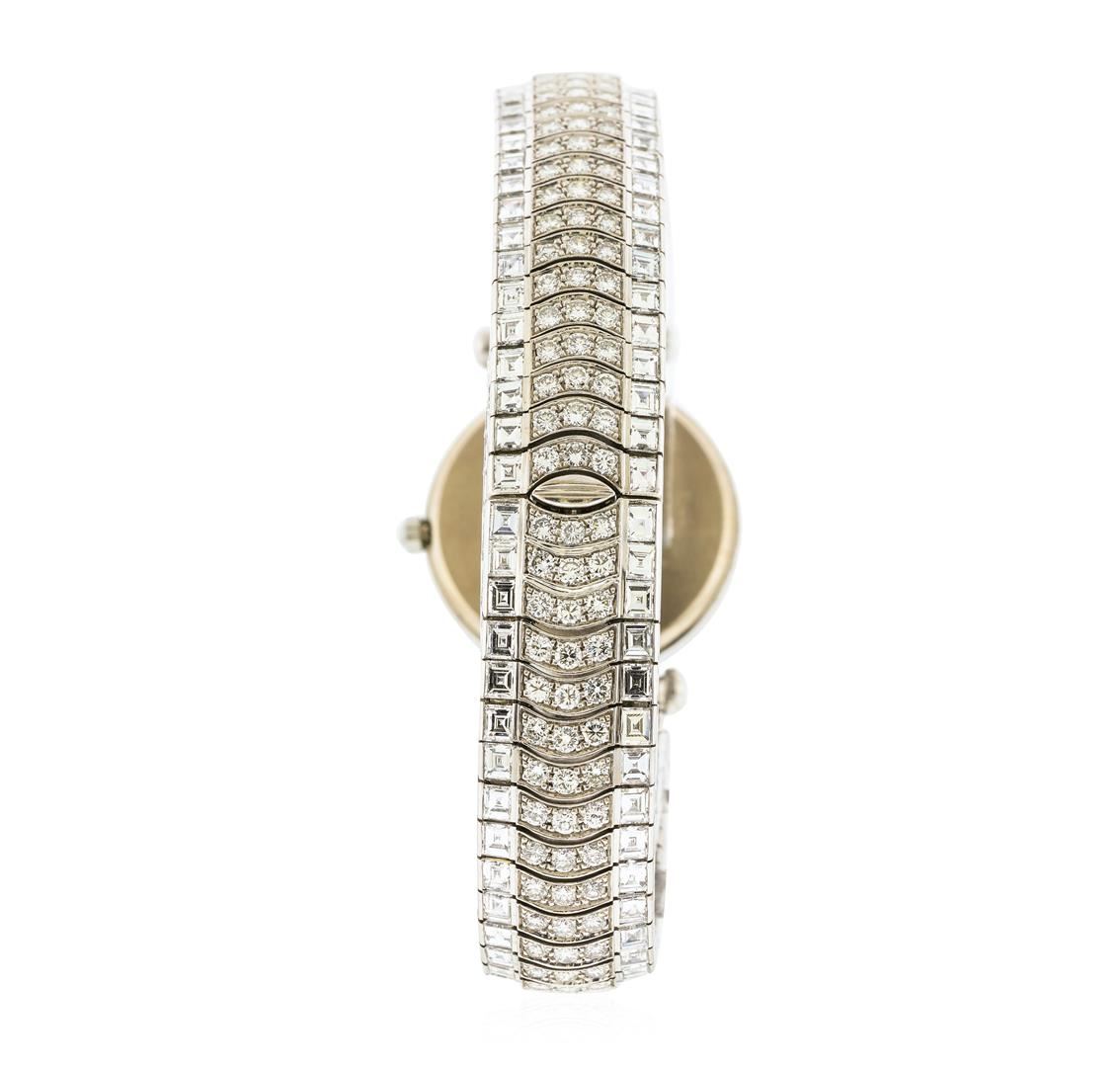 One ladies, Van Cleef & Arpels Diamond wristwatch electronically tested 18KT White gold, Case: 27mm diameter, Swiss Hallmarked Outer Case Back, engraved with the manufacturers logo in high relief, information, and ID numbers, additional space is available for engraving, Swiss Hallmarked Inner Case Back: engraved with the manufacturers name, and ID numbers, Bezel: diamond set, Crystal: synthetic sapphire lens. An Cleef & Arpels Swiss Movement: seven jewel un-adjusted quartz, Dial: set throughout with diamonds, Van Cleef & Arpels Bracelet: flexible diamond set links, Condition: G-7 Near Mint. Six and three quarter inch length. Van Cleef & Arpels Hallmarked 18KT White gold clasp. Containing: Approximately Four Hundred Forty Two; prong & channel set round brilliant, single cut, and baguette cut diamonds, approximate total weight of 442 Stones = 12.85ct. Clarity: VVS-2 to VS-2 Average Color E - G. Total Weight of Diamonds 12.85ct. Total Weight of Watch 57.87gm. AIG Appraised at $50,100.00.