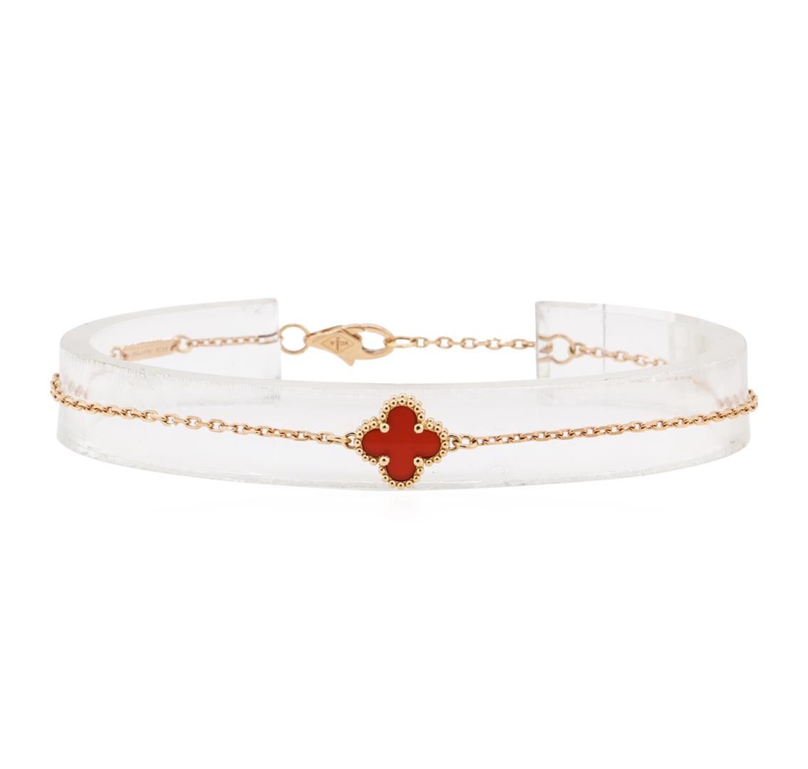 One Van Cleef and Arpels Alhambra bracelet featuring: 18KT rose gold weighing 2.0 grams containing one carnelian. The bracelet measures approximately seven inches in length.