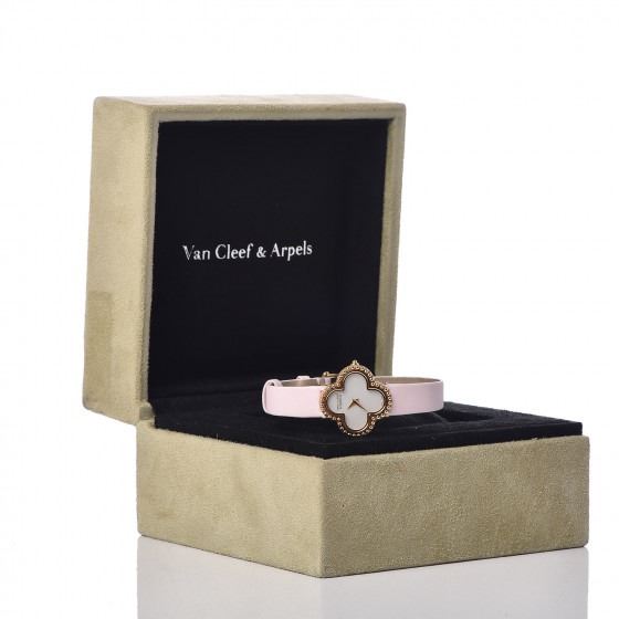 The watch is crafted of 18 karat yellow gold and features an Alhambra motif case with beaded milgrain detail, white mother of pearl dial, sapphire crystal, pink satin strap with gold buckle, and a quartz movement.