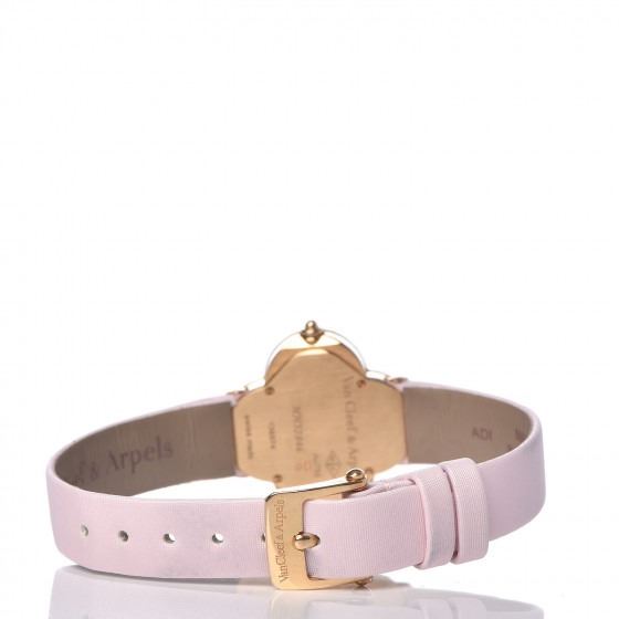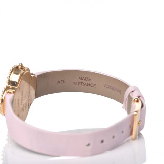 The watch is crafted of 18 karat yellow gold and features an Alhambra motif case with beaded milgrain detail, white mother of pearl dial, sapphire crystal, pink satin strap with gold buckle, and a quartz movement.