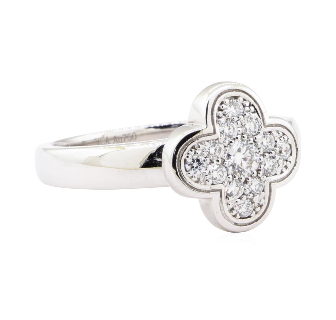 One electronically tested 18KT white gold lady's cast designer ring with a clover motif with a bright polish finish. The featured lady's ring is a Pure Alhambra ring from Van Cleef Arpels and has a shank measuring 2.50 millimeters wide. The serial number is JE431029. Trademark is VCA. Identified with markings of 'AU750'. Condition is new, good workmanship. Containing: One prong set round brilliant cut diamond, measuring 3.10 - 3.05 x 1.85mm (depth est.) approximate weight of 0.10ct. Graded in the setting. Color E - F Clarity VVS-1 to VVS-2 Cut Excellent Twelve prong set round brilliant cut diamonds, measuring 1.80 - 1.70 x 1.05mm (depth est.) approximate total weight of 12 Stones = 0.23ct. Graded in the setting. Color E - F Clarity VVS-1 to VVS-2 Cut Excellent. Total Weight of Diamonds 0.33ct.. Total Weight of Ring 7.70gm GAS Appraised at $5995.00. GAS Appraised at $5,995.00.