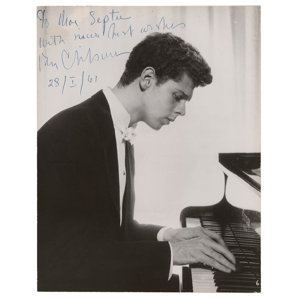 Vintage glossy 7.25 x 9.5 photo of the young pianist, signed and inscribed in blue ballpoint, "To Moe Septu, with sincere best wishes, Van Cliburn, 28/I/61.‰Û Affixed to a same-size mount and in fine condition, with trimmed edges.