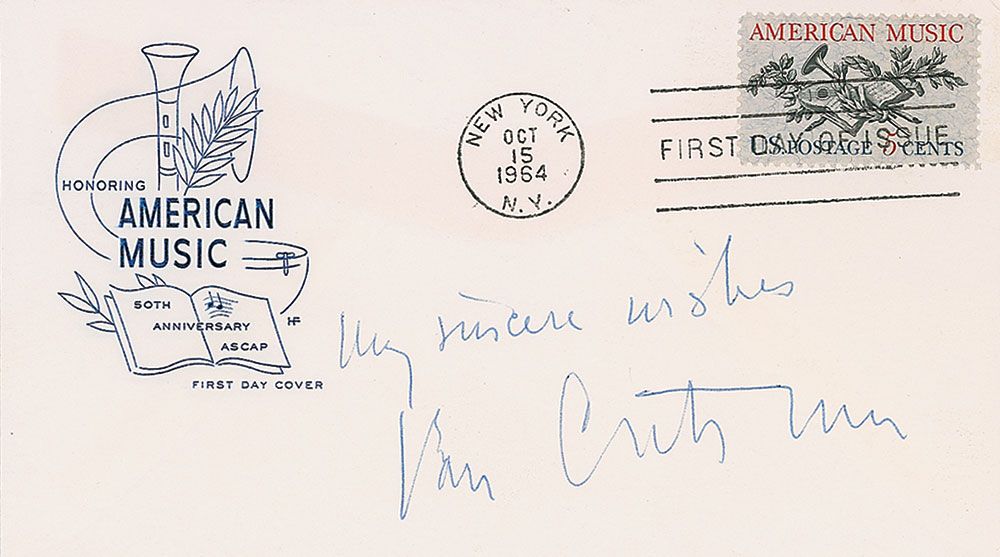 Distinguished American pianist (1934–2013) who skyrocketed to international stardom after winning the inaugural International Tchaikovsky Piano Competition in 1958. FDC with a cachet honoring American music, signed on the front in blue ballpoint, “Very sincere wishes, Van Cliburn.” In fine condition.