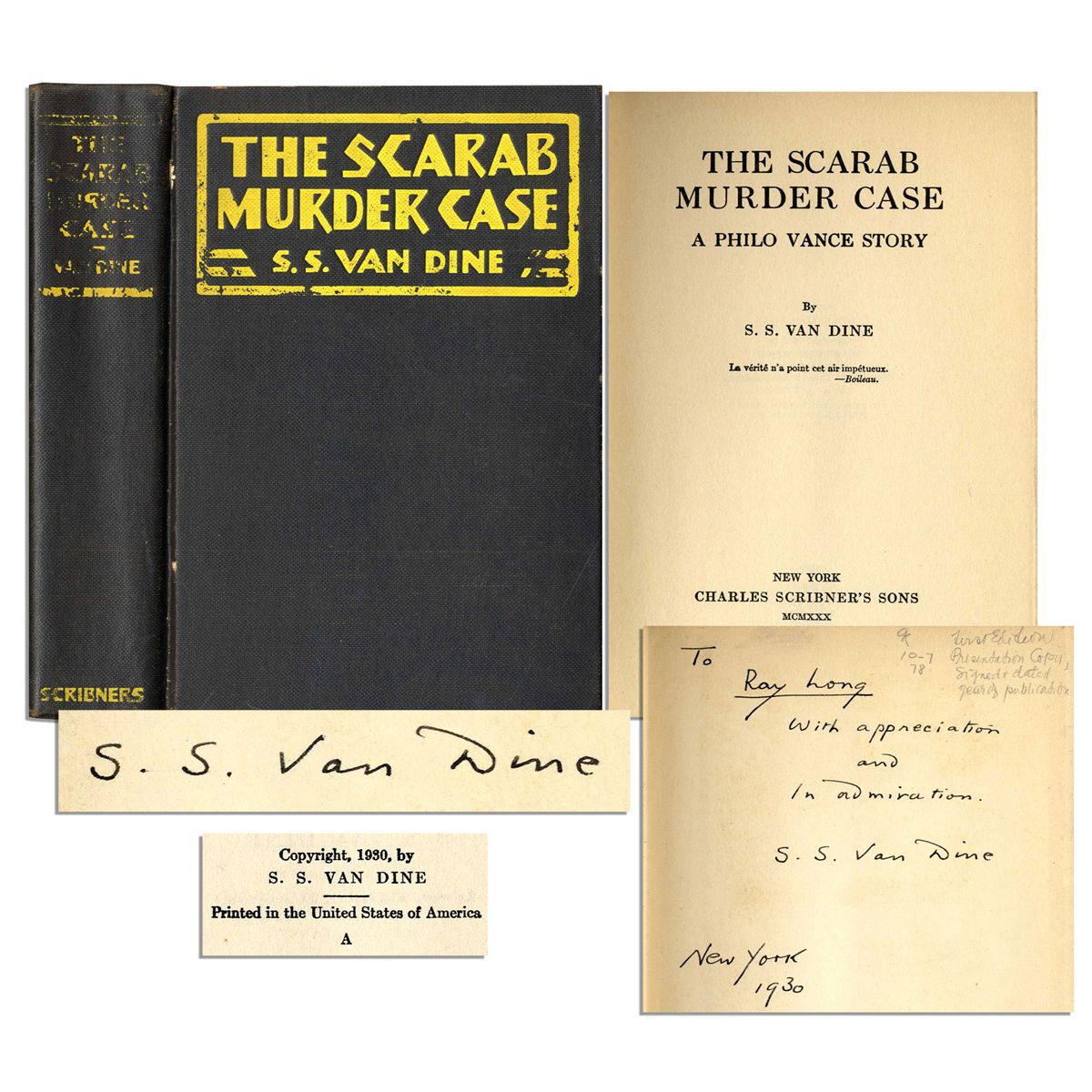 S.S. Van Dine signed first edition of ''The Scarab Murder Case''. Charles Scribner's Sons: New York: 1930. The author signs upon the front free endpaper: ''To Ray Long / With appreciation and in admiration / S.S. Van Dine / New York 1930''. Willard Wright created the Van Dine pen name and the popular Philo Vance detective series in the 1920's and 1930's. Ray Long was an important editor and literary critic of that era. Fading to backstrip and minor chipping to 5.25'' x 7.5'' hardcover book. Overall very good condition.
