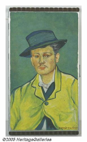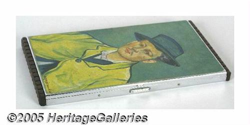 <B>Van Gogh Image FDR Personal Cigarette Case</B></I> President Franklin D. Roosevelt frequently enjoyed a cigarette while working and performing the tasks of his office. Toi Bachelder served as his secretary during his entire time in office, and spent countless hours taking dictation. During one of these sessions in the President's study, he paused briefly and said, "Toi, would you like to have this?" She accepted the 3" by 5 1/2" cigarette case which features a reproduction of Van Gogh's <I>Man in the Straw Hat</B></I> painting, and is monogrammed, "FDR," on the reverse. A two-page hand-written letter, signed by Bachelder, recounts the gift as well as shares insight on her time with FDR and other Presidents during her tenure at the White House (1933-1967). Lot:254