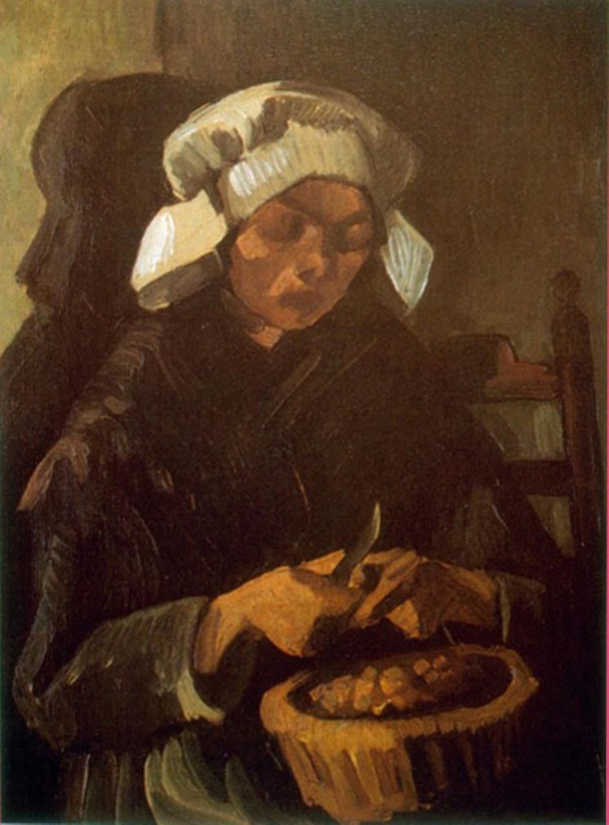 Artist: Vincent Van Gogh - Title: Potatoes  - Medium: Fine Art Reproduction Giclee on Archival Canvas - Image Size: Approximately 32 inches x 23.5 inches -  Unframed on Unstretched Canvas - Biography: Vincent van Gogh (born March 30, 1853, Zundert, Neth.--died July 29, 1890, Auvers-sur-Oise, near Paris, France), - Van Gogh was a Dutch painter, generally considered the greatest after Rembrandt, and one of the greatest of the Post-Impressionists. The striking color, emphatic brushwork, and contoured forms of his work powerfully influenced the current of Expressionism in modern art. Van Gogh's art became astoundingly popular after his death, especially in the late 20th century, when his work sold for record-breaking sums at auctions around the world and was featured in blockbuster touring exhibitions. In part because of his extensive published letters, van Gogh has also been mythologized in the popular imagination as the quintessential tortured artist.