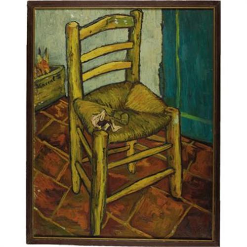 <B>Van Gogh's Chair Painting from "Lust for Life."</B></I> Vincent Minnelli's masterpiece <I>Lust for Life</B></I> almost didn't get made. MGM sat on the rights to Irving Stone's book of the same name for close to ten years, but after a ground-breaking exhibition of Van Gogh's work in 1955, the studio quickly picked up on the mounting public interest and was left with a little less than nine months to make the film. This posed a great problem for Minnelli as the rights to create reproductions of the vast amount of Van Gogh's pieces had to be quickly worked out with the museums and collectors owning the works. The majority were then reproduced as large-format transparencies, back-lit for scenes in which they appeared. This piece, however, is one of the few screen-used hand-painted images from the film. Van Gogh's iconic chair and pipe with his trademark heavy impasto is so closely replicated it is as if you are standing in front of the actual 1888 painting (the real one is housed in the National Gallery, by the way). The result of such painstaking work to replicate the paintings for the film transformed them from simple props to characters themselves, integral to the film's success, and earned <I>Lust for Life</B></I> an Oscar nomination for Best Art Direction-Set Direction. The painting on canvas is framed to an overall size of 30" x 38" and is in Very Fine condition with a few minor areas of chipped paint and signs of handling to the frame. Interestingly, there is an MGM stamp en verso reading: "Warning This is not an original oil painting by Van Gogh but only a copy made by the Metro-Goldwyn-Mayer Studios for its motion picture purposes."<BR><BR><b>Shipping:</b> Framed - without Glass, Medium (<a target="_blank" href="http://www.heritageauctions.com/common/shipping.php">view shipping information</a>)
