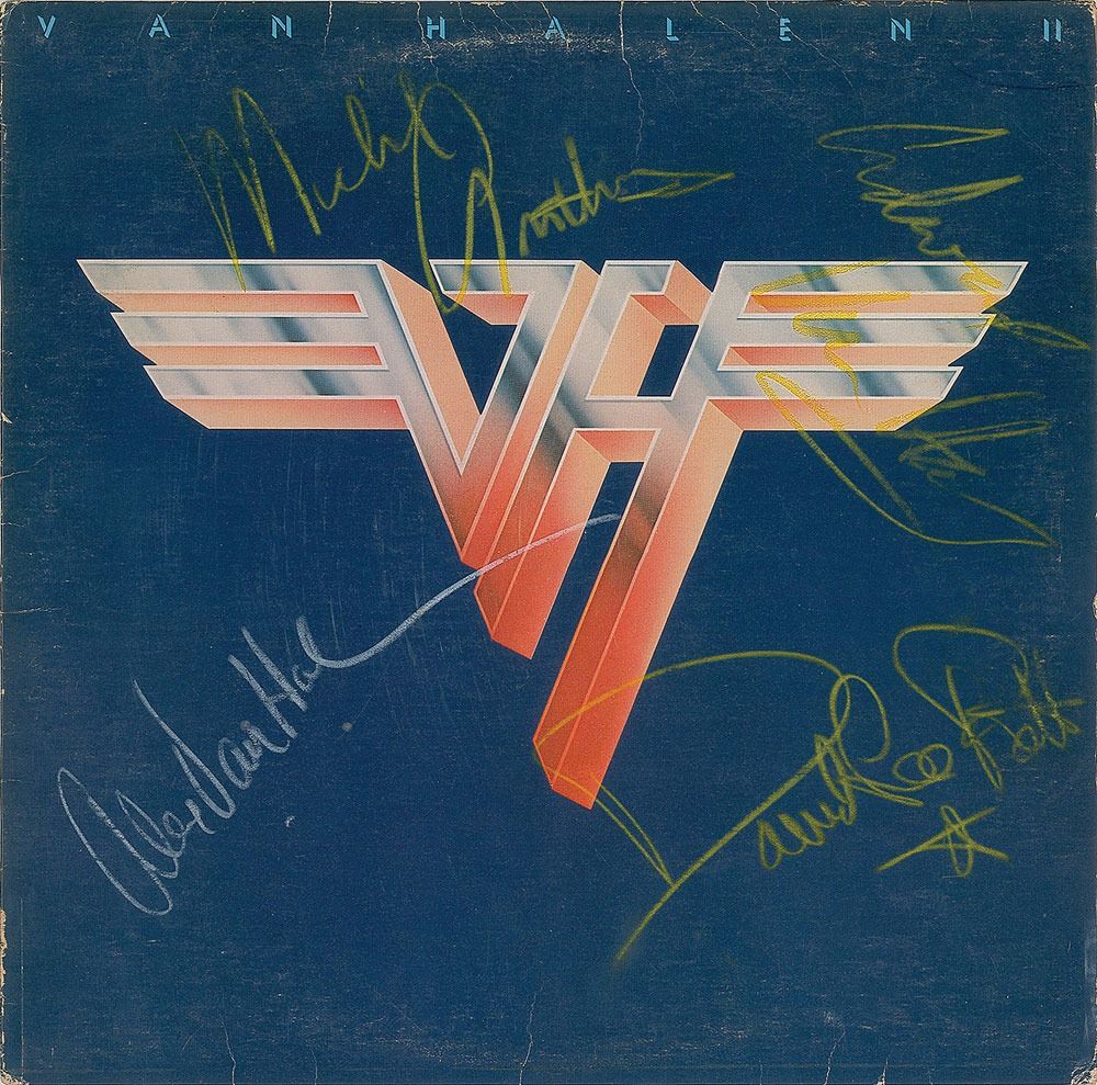 Van Halen II album signed on the front cover in white and yellow grease pencil by Eddie Van Halen, Alex Van Halen, Michael Anthony, and David Lee Roth. In very good to fine condition, with scattered scuffing and creasing. The record is included.